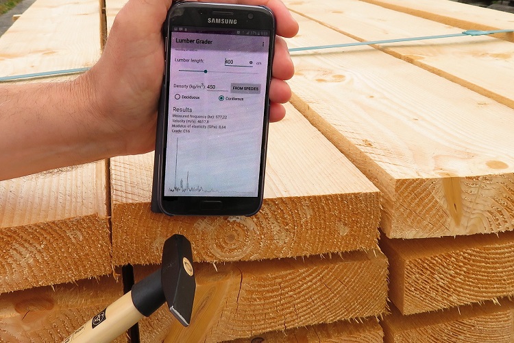共振木材分級計是一個簡單的工具。它由一把錘子和一個帶有專門軟件的Android手機或平板電腦組成。用戶輸入長度、選擇樹種,木材分級計將采用該樹種的平均密度,用于可以覆蓋已有的密度值。然后敲擊木材的端部基于EUROCODE338標準的分級即顯示在屏幕上。由于密度的不確定性,該分級僅作為參考信息。